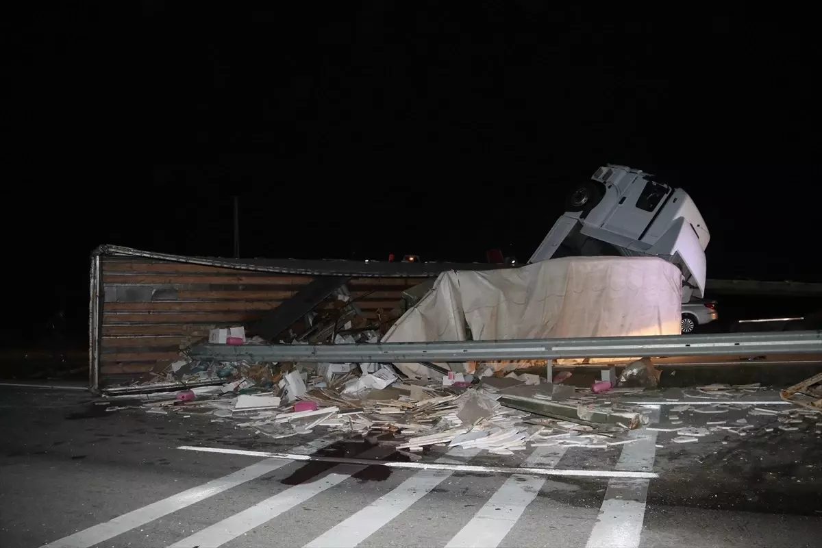 Bursa'nın İnegöl ilçesinde tır devrildi, sürücüsü yaralandı ve hastaneye kaldırıldı.