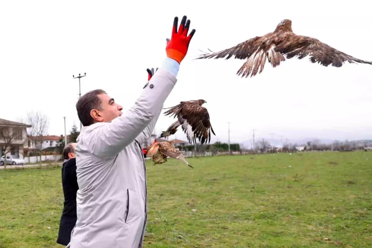 Düzce'de tedavi edilen 4 kızıl şahin, Vali Aslan tarafından doğal yaşam alanlarına bırakıldı.