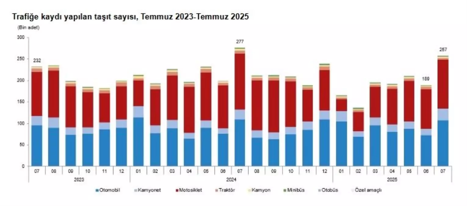 TÜİK, temmuzda trafiğe kaydı yapılan taşıt sayısının %36,1 artarak 257 bin 471 olduğunu açıkladı.