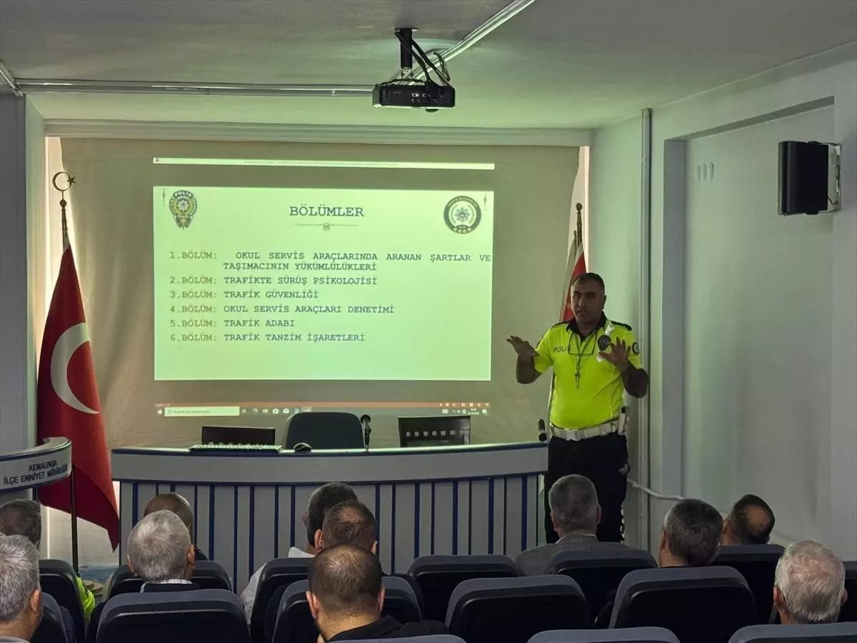 İzmir Kemalpaşa'da okul servisi sürücülerine trafik kuralları eğitimi verildi.