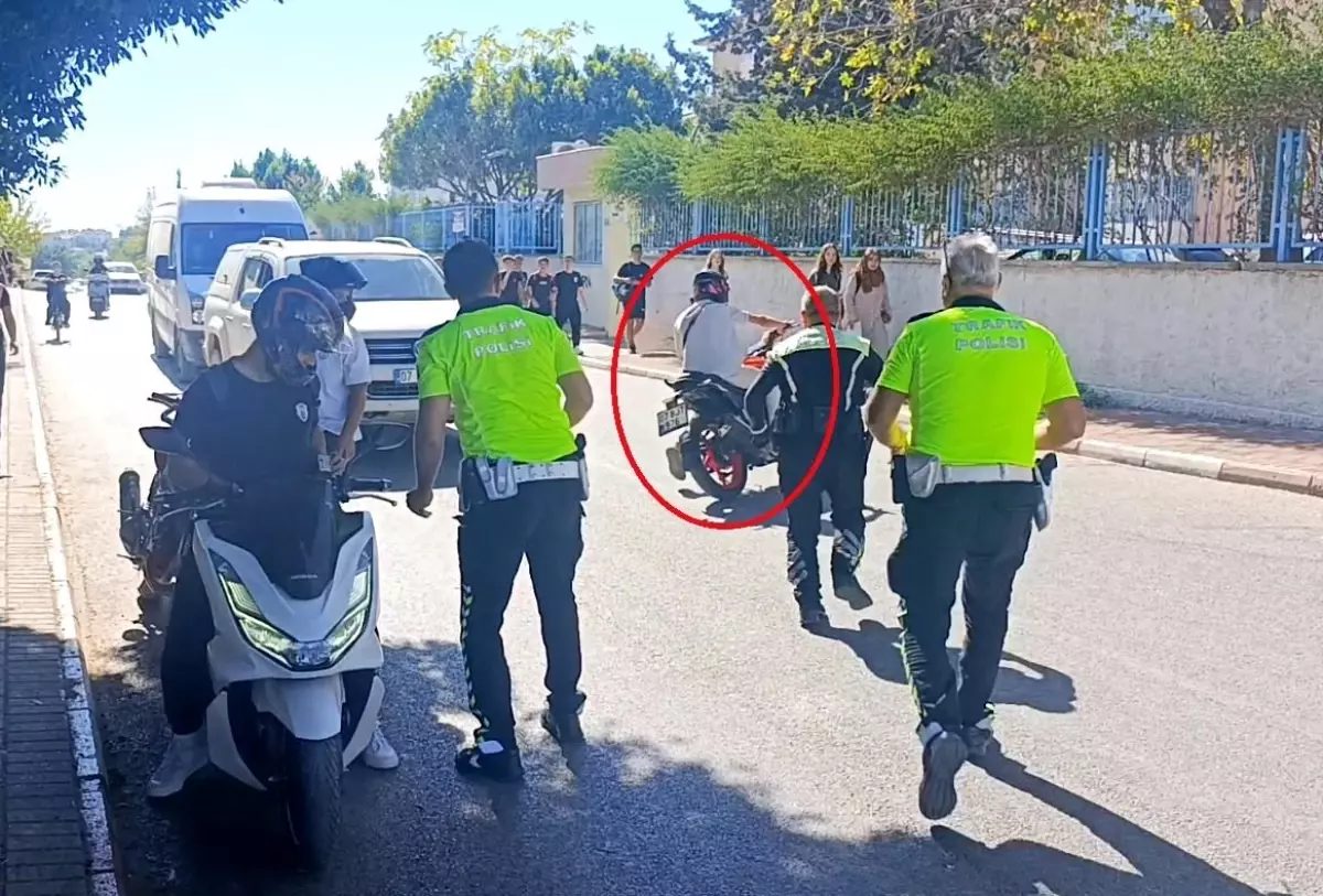 Öğrencilerin güvenliği için yapılan denetimde, bir motosikletli polis arkasını dönerken kaçtı.