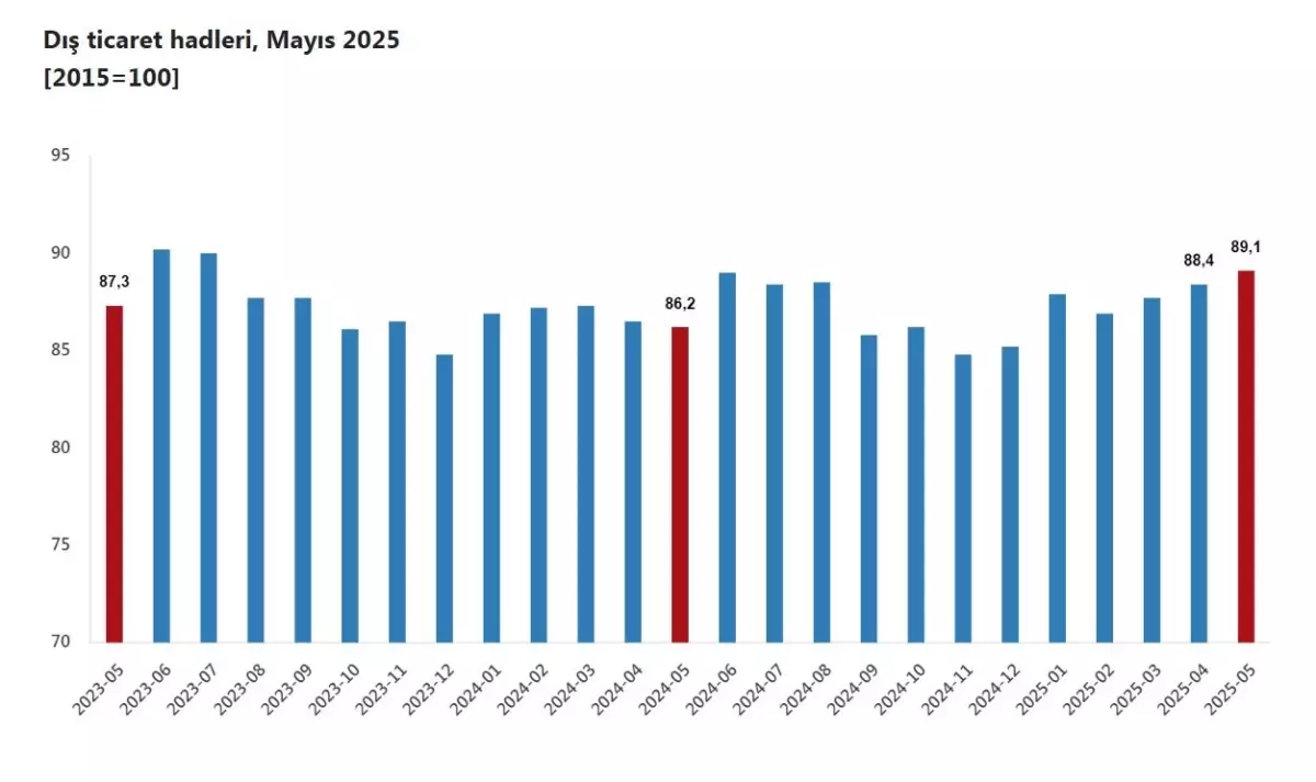 Mayıs 2025'te dış ticaret haddi 89,1'e çıkarak 2,9 puan yükseldi. İhracat ve ithalat verileri açıklandı.