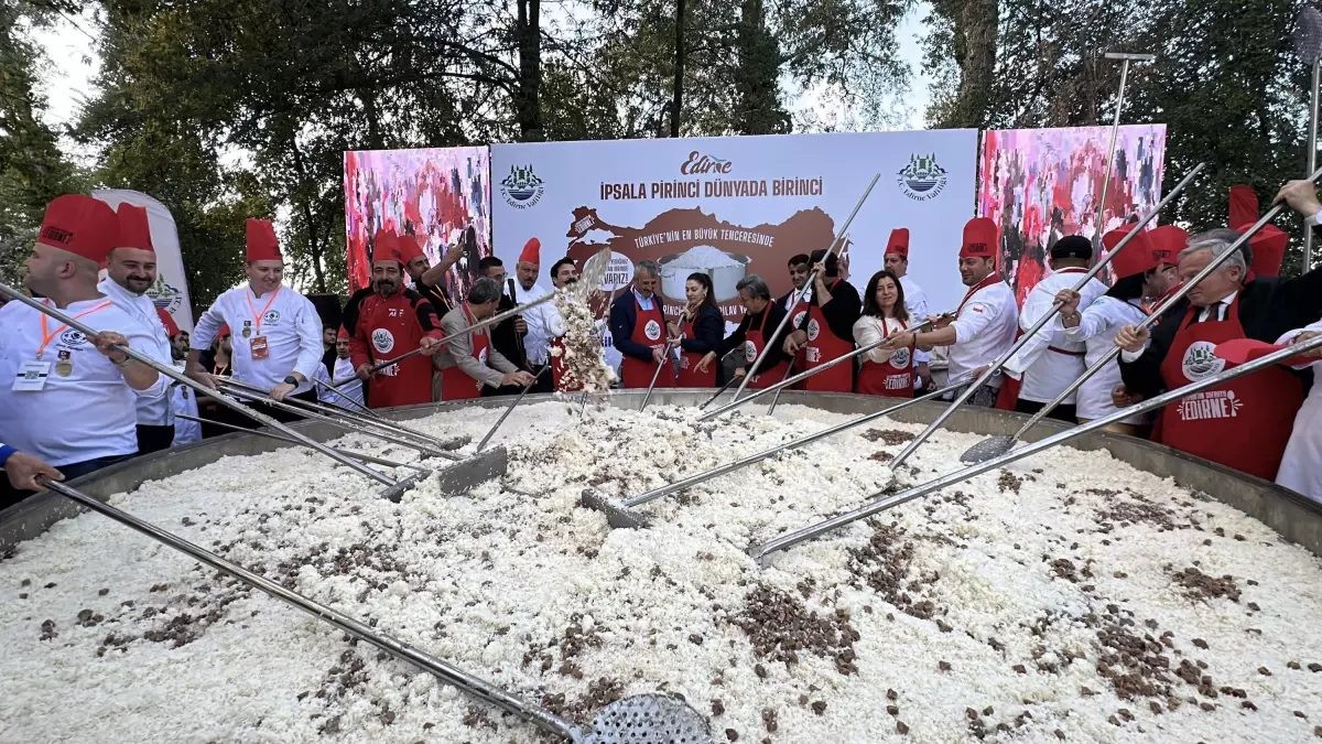 Edirne Gastronomi Festivali'nde Türkiye'nin en büyük tenceresinde 6 ton pilav pişirilerek dağıtıldı.