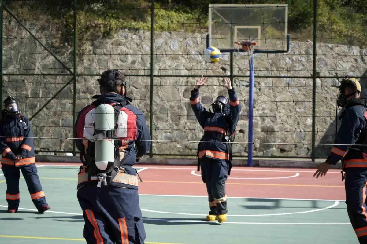 Gümüşhane'deki itfaiyecilik programı öğrencileri, kıyafetleriyle voleybol oynayarak pratik yapıyor.