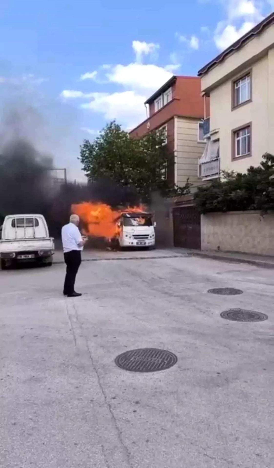 Ümraniye Kadosan Sanayi Sitesi’nde park halindeki bir minibüsün yanarak kullanılamaz hale geldiği anlar çevredekiler tarafından kayda alındı.