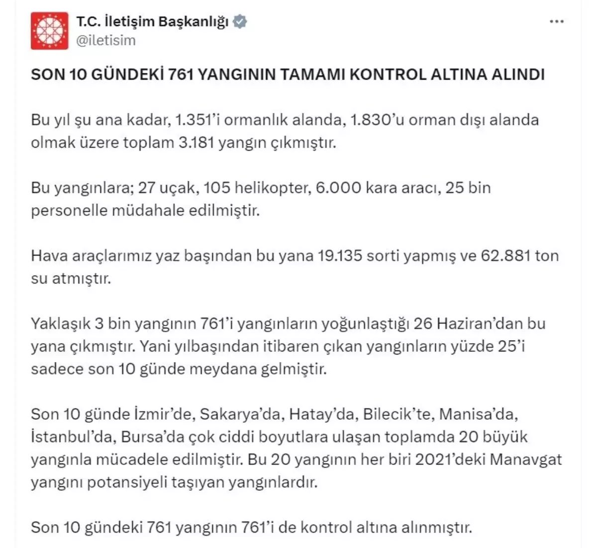 Son 10 günde çıkan 761 yangın kontrol altına alındı; toplamda 3 bin 181 yangın çıktı.