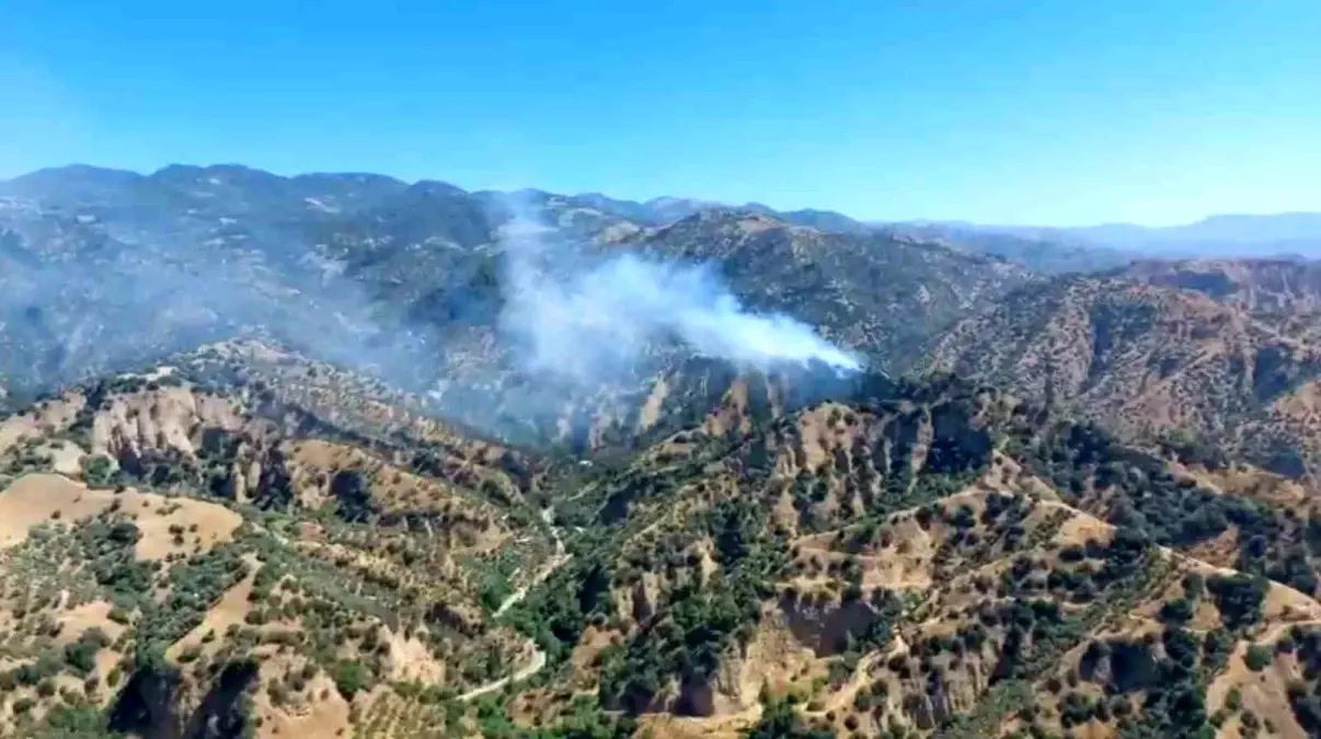 Aydın'ın Yılmazköy'de zeytinlikte çıkan yangın havadan ve karadan söndürülmeye çalışılıyor.