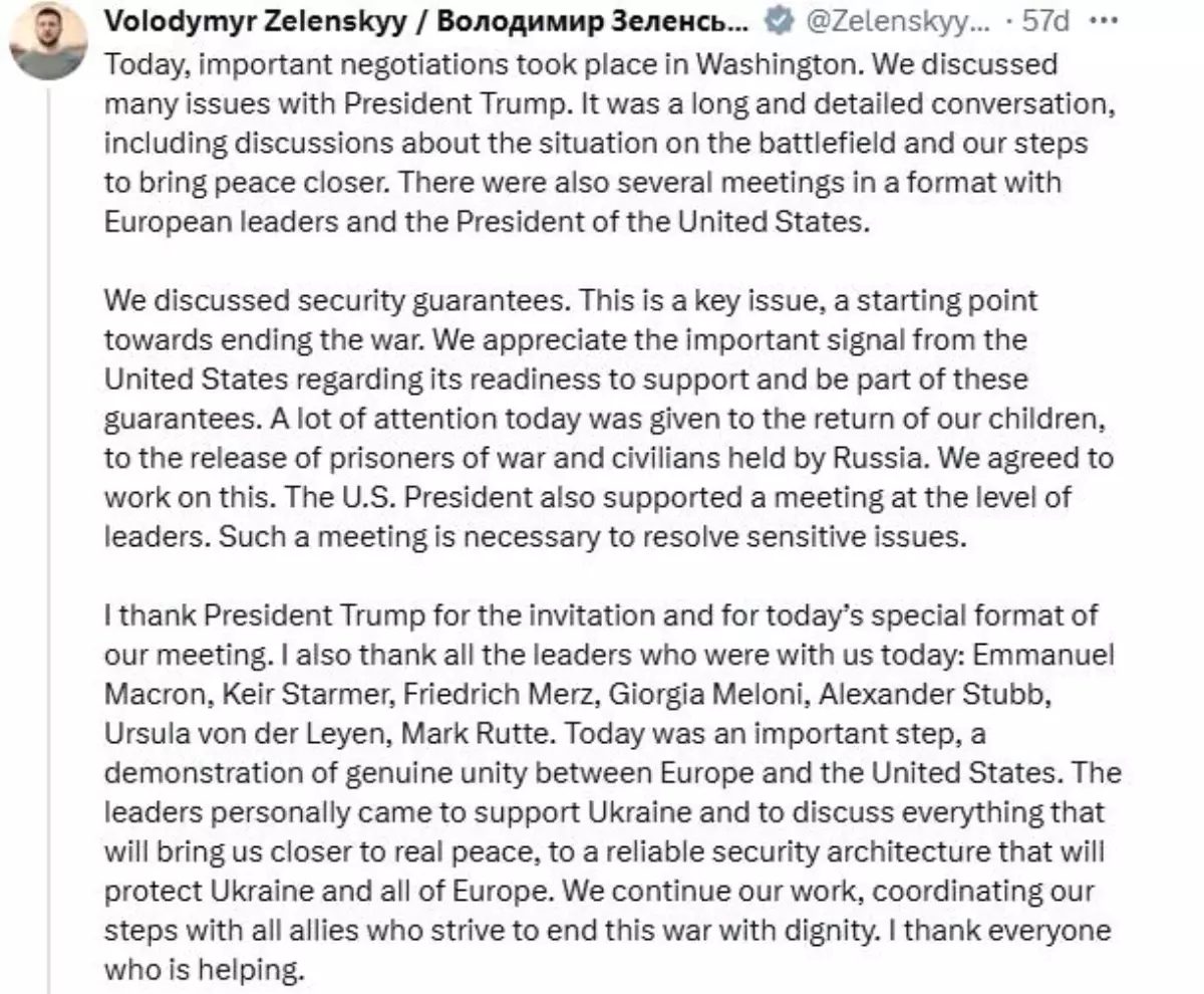 ABD Başkanı Trump Rusya Devlet Başkanı Putin’den sonra Zelenskiy ve AB Ülkelerinin temsilcileriyle görüştü. Görüşmeyi değerlendiren Türk Uzmanlar barış için toprak takası ve güvenlik garantisi sorunlarının çözülmesi gerektiğini belirtti.