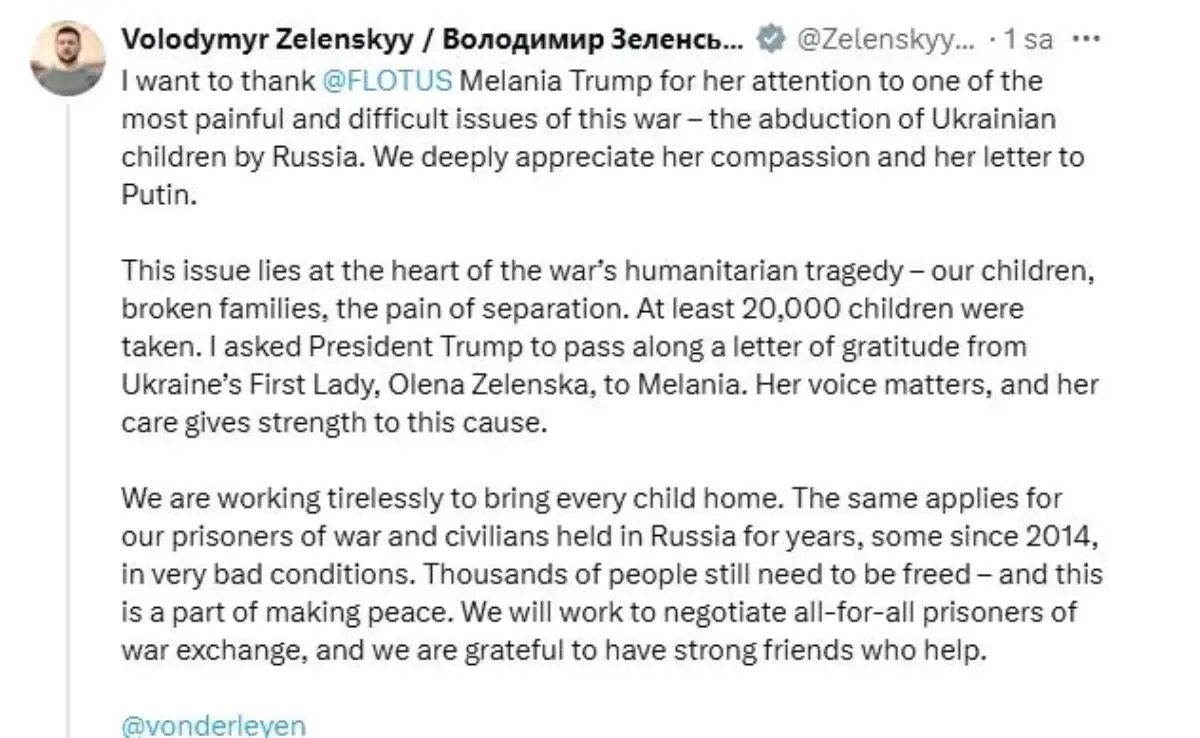 Zelenskiy, Melania Trump'ın Ukraynalı çocuklar için gösterdiği ilgiye teşekkür etti.