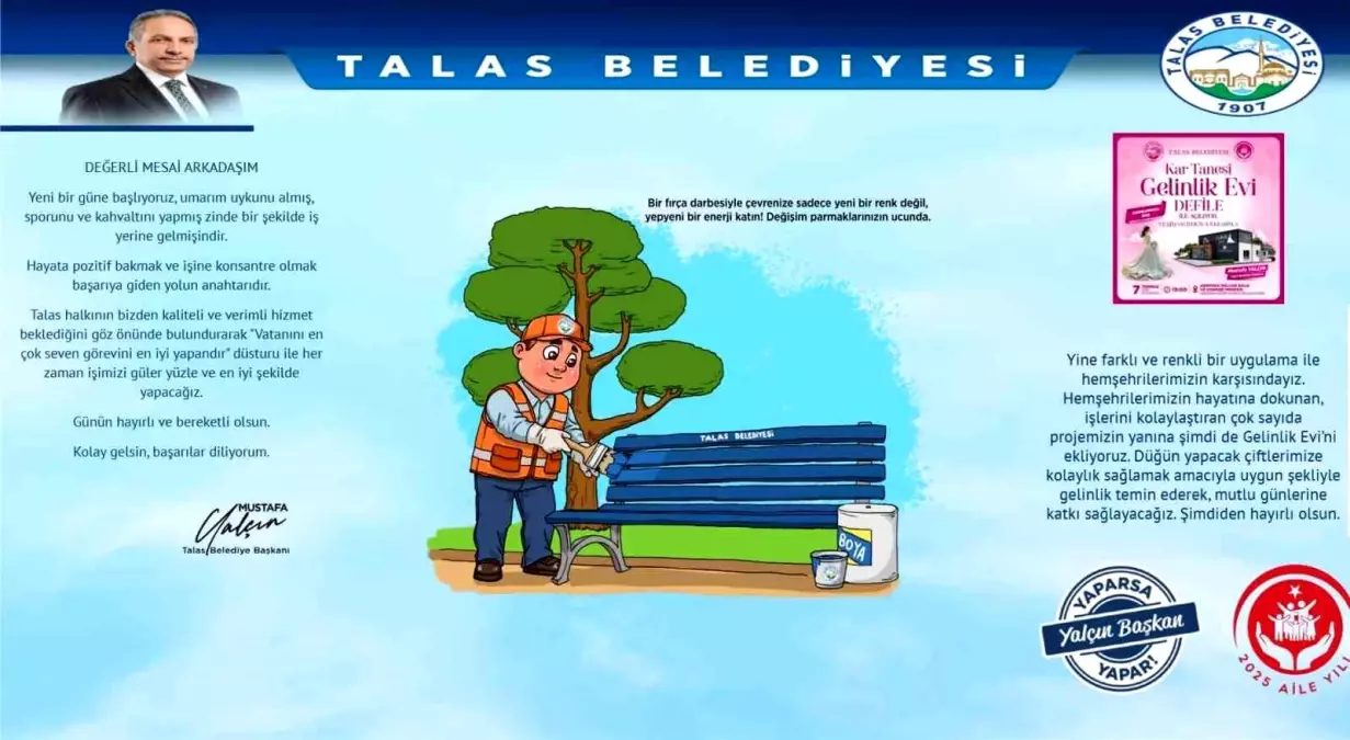 Başkan Yalçın mesajını; “Kolay gelsin, başarılar diliyorum” sözleriyle tamamlayarak personelin moral ve bağlılığını artırmayı hedefliyor. Bu anlamlı uygulama, belediyeciliği sadece teknik hizmetlerden ibaret görmeyen, insan odaklı bir anlayışın yansıması olarak dikkat çekiyor. Güleryüz, samimiyet ve iş ahlakının ön planda olduğu mesajlar, personelin görevine daha yüksek motivasyonla sarılmasına katkı sağlıyor. Öte yandan mesajda Talas Belediyesi’nin yeni yatırım ve hizmetlerinin duyurulduğu bölüm de yer alıyor. Son olarak hayata geçirilen ve Türkiye’de projesi yarışma ile belirlenen tek millet bahçesi olan Talas Millet Bahçesi’nin açılışıyla ilgili duyuru yer alıyor.