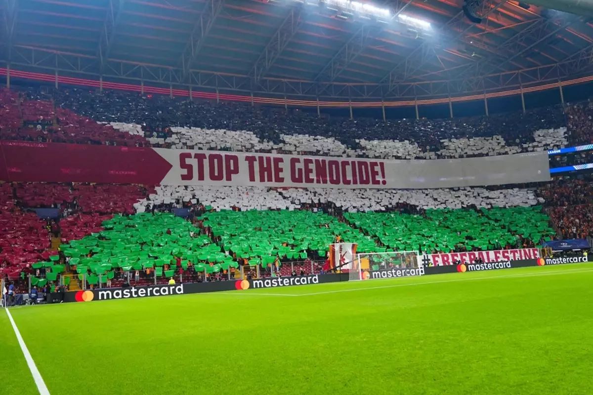UEFA Şampiyonlar Ligi’nde Galatasaray, sahasında Bodo/Glimt’i 3-1 mağlup ederek büyük bir galibiyet elde etti. Ancak maç öncesinde tribünlerde gerçekleştirilen Filistin temalı koreografi, Avrupa basınında geniş yankı uyandırdı. Sarı-kırmızılı taraftarlar, dev bir Filistin bayrağı açarak üzerine İngilizce “Stop The Genocide (Soykırımı Durdurun)” yazılı bir pankart sergiledi. Bu güçlü mesaj, tüm dünyada yankı bulurken, İngiliz basınında dikkat çekici bir iddia ortaya atıldı.