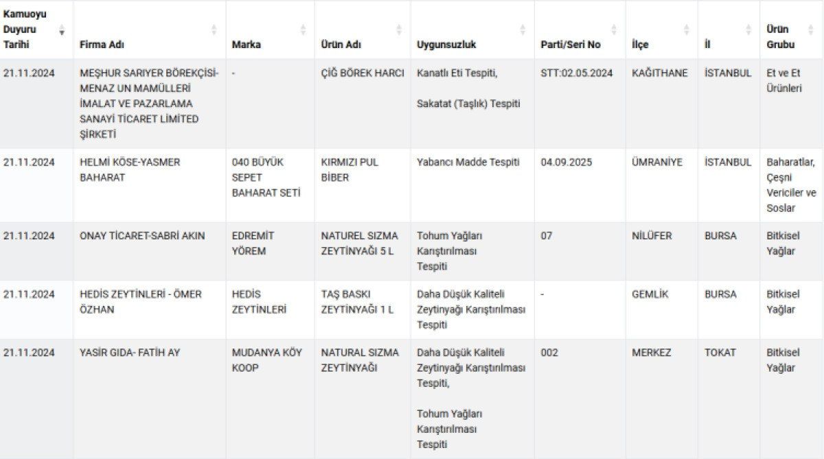 Listede bulunan ürünlerde, kanatlı eti, sakatat ve tek tırnaklı tespiti ile taklit, tağşiş ve bitkisel yağ tespiti gibi birçok uygunsuzluk yer alıyor.