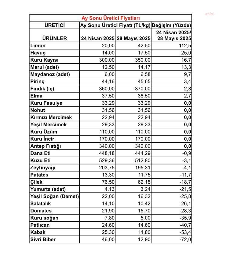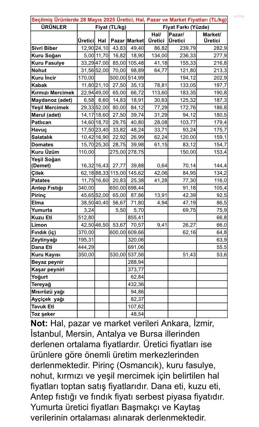 “Sivri biberdeki fiyat farkını yüzde 278 ile kuru soğan, yüzde 217 ile kuru fasulye, yüzde 213 ile nohut, yüzde 203 ile kuru incir takip etti. Sivri biber ve kuru soğan 3,8 kat, kuru fasulye 3,2 kat, nohut 3,1 kat, kuru incir ve kabak 3 kat fazlaya satıldı. Üreticide 13 lira olan sivri biber 49 liraya, 5 lira olan kuru soğan 19 liraya, 33 lira olan kuru fasulye 105 liraya, 31 lira olan nohut 99 liraya, 170 lira olan kuru incir 515 liraya ve 12 lira olan kabak 35 liraya markette satıldı. Mayıs ayında fiyatı en fazla artan ürün hem markette hem üreticide limon olurken, fiyatı en fazla düşen ürün hem markette hem üreticide sivri biber oldu.