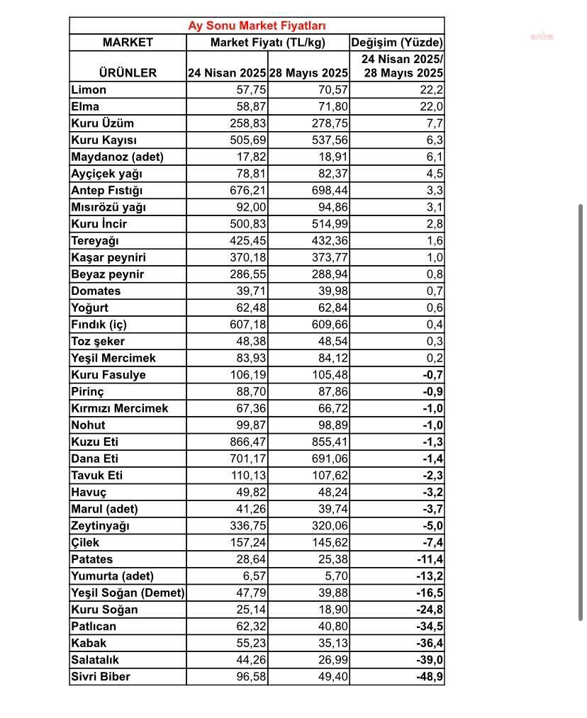Mayıs ayında markette 36 ürünün 17’sinde fiyat artışı, 19’unda ise fiyat azalışı görüldü. Mayıs ayında markette fiyatı en fazla artan ürün yüzde 22 ile limon ve elma oldu. Limon ve elmadaki fiyat artışını yüzde 8 ile kuru üzüm, yüzde 6 ile kuru kayısı ve maydanoz takip etti. Markette fiyatı en fazla azalan ürün ise yüzde 49 ile sivri biber oldu. Sivri biberdeki fiyat düşüşünü yüzde 39 ile salatalık, yüzde 36 ile kabak, yüzde 34 buçuk ile patlıcan izledi.