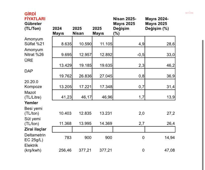 Ziraat Odalarımız aracılığıyla girdi piyasalarından aldığımız fiyat verilerine göre; Mayıs ayında, Nisan ayına göre amonyum sülfat gübresi yüzde 4,9, üre gübresi yüzde 2,3, DAP gübresi yüzde 0,8, 20.20.0 kompoze gübresi yüzde 0,7 oranında artış gösterdi. Buna karşın amonyum nitrat gübresi yüzde 0,5 oranında düştü. Geçen yılın Mayıs ayına göre son bir yılda üre gübresi yüzde 46,2, DAP gübresi yüzde 36,9, amonyum nitrat gübresi yüzde 33, 20.20.0 kompoze gübresi yüzde 31,4 ve amonyum sülfat gübresi yüzde 28,6 oranında arttı. Mayıs ayında Nisan ayına göre süt yemi yüzde 2,7, besi yemi yüzde 2, son bir yılda besi yemi yüzde 27,2, süt yemi yüzde 26,4 oranında arttı. Elektrik fiyatları yıllık olarak yüzde 47,08 oranında artarken tarım ilacı fiyatları yüzde 14,94 oranında arttı. Mayıs ayında mazot fiyatı aylık olarak yüzde 1,7 oranında artarken, yıllık yüzde 13,9 oranında arttı. Girdi fiyatlarında yıllık bazda en fazla artış yüzde 47,08 oranıyla elektrikte görüldü.