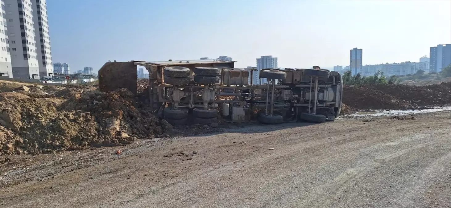 Mersin’in Tarsus ilçesinde, hafriyat kamyonu kasasında yüklü kumu boşalttığı sırada devrildi.