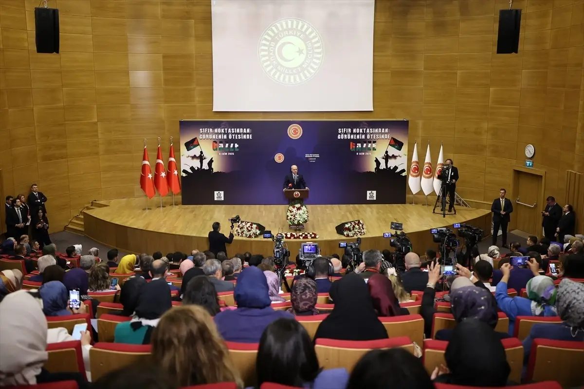 TBMM Başkanı Kurtulmuş, Gazze soykırımının üzerinden iki yıl geçmesine rağmen hala saldırıların sürdüğünü dile getirerek, İsrail’in, en son Küresel Sumud Filosu’na Akdeniz’in uluslararası sularında ağır silahlı askerlerle müdahale ettiğini ve 40’ı aşkın ülkeden yüzlerce insanı gayriinsani şartlarda gözaltına alarak İsrail’e götürdüğünü anlattı.