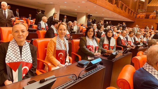 Öte yandan olağanüstü oturumda milletvekilleri Filistin Türkiye bayraklarını taşıyan atkılar taktı.