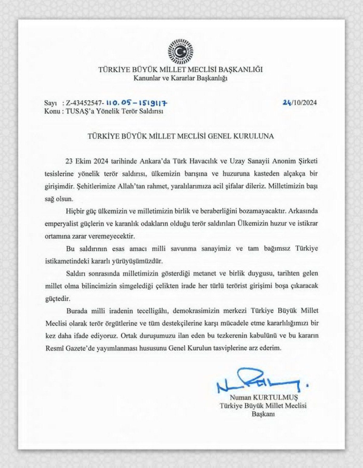 TBMM Genel Kurulunda kabul edilen Meclis Başkanlığı tezkeresiyle TUSAŞ Kahramankazan yerleşkesine yönelik terör saldırısı kınandı.