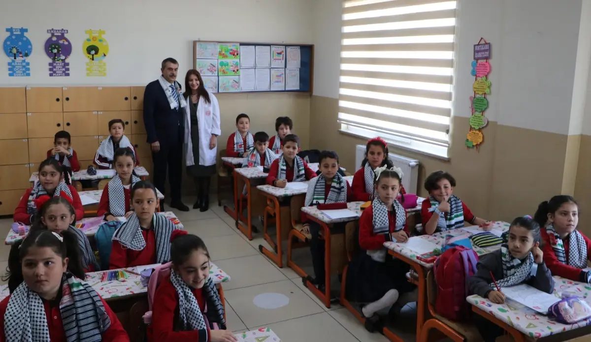 Türkiye’de bütün okullarda bugün ‘Filistin Farkındalık Etkinliği’ düzenlendi. Erzurum Ömer Duygun İlkokulu’ndaki etkinliğe katılan Milli Eğitim Bakanı Yusuf Tekin’i öğrenciler Filistin atkısı takarak karşıladı. Yanına aldığı öğrencilerle okul bahçesinde yere serilen tuvale resim çizen, Filistin’le ilgili yazılar yazan öğrencileri izleyen Bakan Tekin, onlarla sohbet etti. Öğrencilerin çalışması hakkında bilgi alan Tekin, ziyaret ettiği bir sınıfa girerken ‘Mescid-i Aksa’ şiiriyle karşılandı. Şiir okuyan öğrenciyi tebrik eden Bakan Tekin, bir süre işlenen dersi izledi. Bakan Tekin, Filistinlilerin, İsrailli vahşilerin zulmüne maruz bırakıldığını ifade ederek, “Bize düşen atalarımızın bize bıraktığı her zaman mazlumların yanında olma geleneği, bu bizim için bir değer. Bugün atalarımıza duyduğumuz saygının gereği olarak da bunu yapmamız lazım. Dünyanın neresinde olursa olsun hakkı elinden alınan bir çocuk varsa yaşama hürriyeti, elinden alınan bir insan varsa ya da zulüm altında inleyen bir insan varsa biz hep onların yanında olduk” diye konuştu.