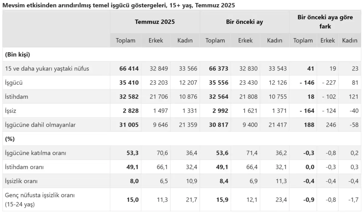 TÜİK, temmuz ayında işsizlik oranının 0,4 puan azalarak yüzde 8 seviyesine düştüğünü açıkladı.