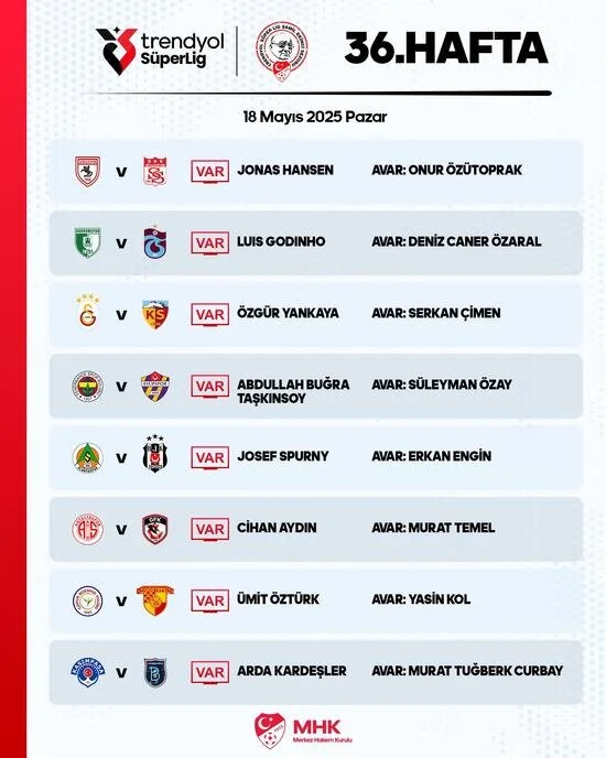 Galatasaray – Kayserispor maçının VAR hakemi Özgür Yankaya olurken Fenerbahçe – Eyüpspor maçına Abdullah Buğra Taşkınsoy atandı.