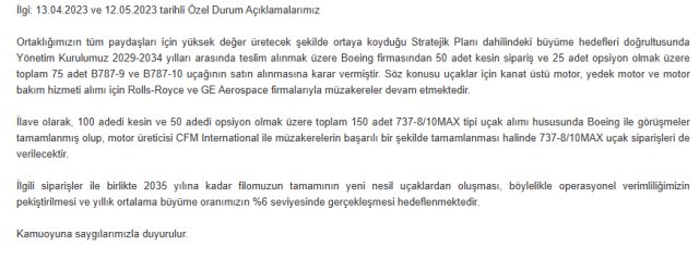 THY, ilgili siparişlerin devreye girmesiyle birlikte 2035 yılına kadar filosunun tamamen yeni nesil uçaklardan oluşmasını planlıyor. Bu dönüşümle birlikte şirketin operasyonel verimliliğinin artması ve yıllık ortalama büyüme oranının yüzde 6 seviyesinde gerçekleşmesi hedefleniyor.