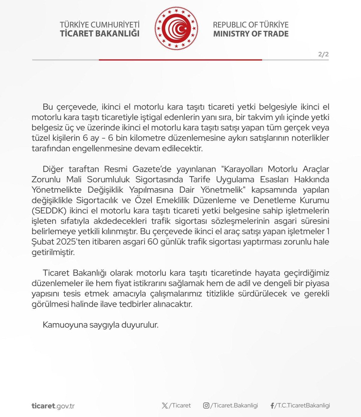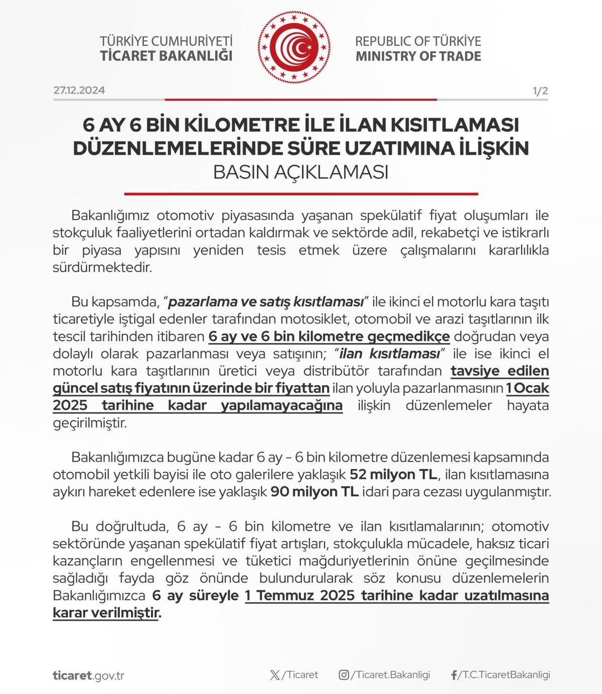 Ticaret Bakanlığı, yaptığı açıklamada, “İkinci el motorlu kara taşıtı ticaretinde 6 ay, 6 bin kilometre ve ilan kısıtlamalarının 6 ay süreyle 1 Temmuz 2025 tarihine kadar uzatılmasına karar verilmiştir.” dedi.