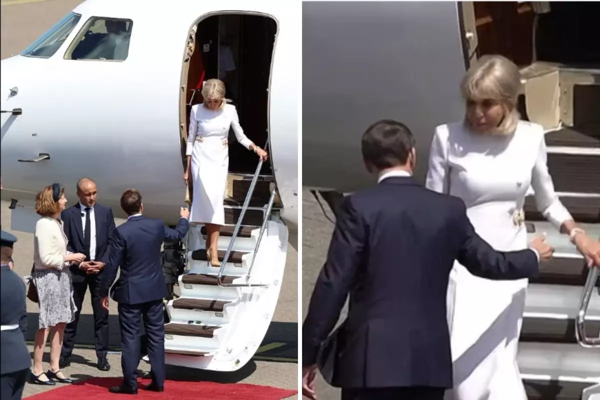 Macron, uçaktan inerken eşi Brigitte’ye yardım etmek için elini uzattı. Fakat Brigitte, eşinin elini tutmak yerine korkuluğu tercih etti. Macron eli havada kalınca, hafif bir gerginlik yaşandı. Ardından Fransa Cumhurbaşkanı, Prenses Kate’in elini öperek protokol selamlaşmasına geçti.