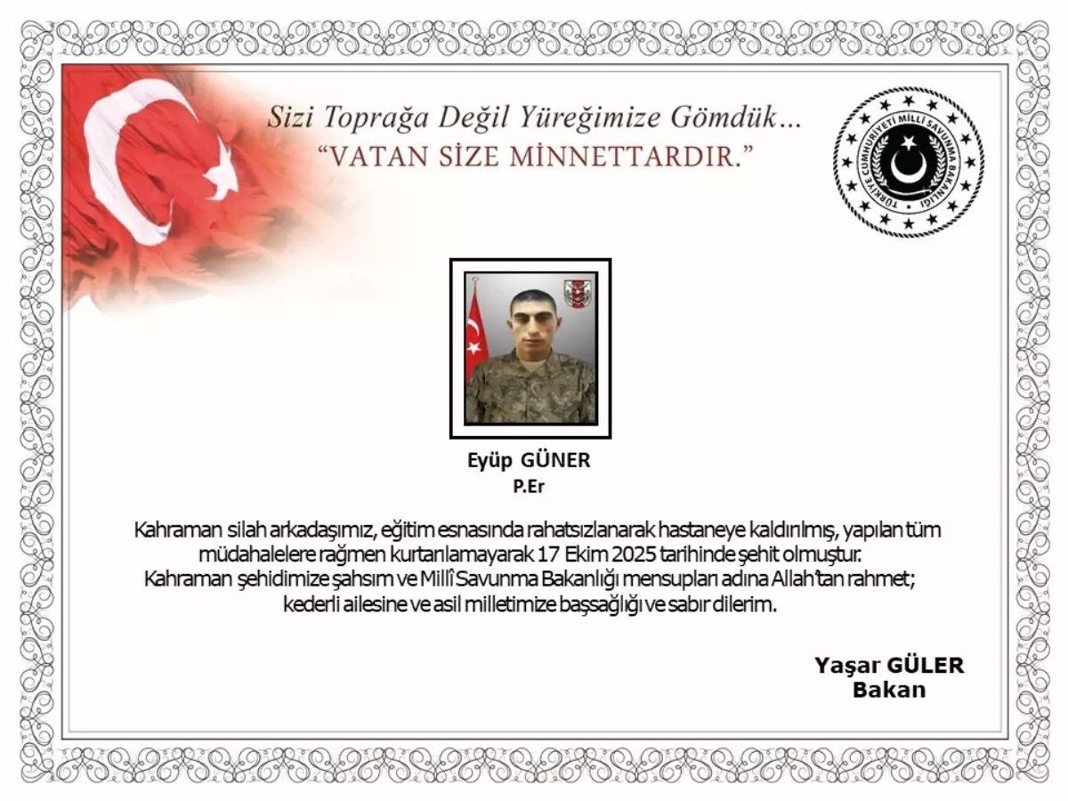 Milli Savunma Bakanlığı (MSB) sosyal medya hesabından yapılan paylaşımda, “Tokat’ta görev yapmakta olan kahraman silah arkadaşımız Piyade Er Eyüp Güner, eğitim esnasında rahatsızlanarak hastaneye kaldırılmış, yapılan tüm müdahalelere rağmen kurtarılamayarak 17 Ekim 2025 tarihinde şehit olmuştur. Bizleri derin bir acı ve üzüntüye boğan bu olayda hayatını kaybeden aziz şehidimize Allah’tan rahmet, kederli ailesine, Türk Silahlı Kuvvetleri ile asil milletimize başsağlığı ve sabır dileriz” ifadeleri kullanıldı.