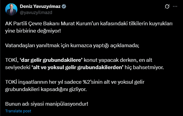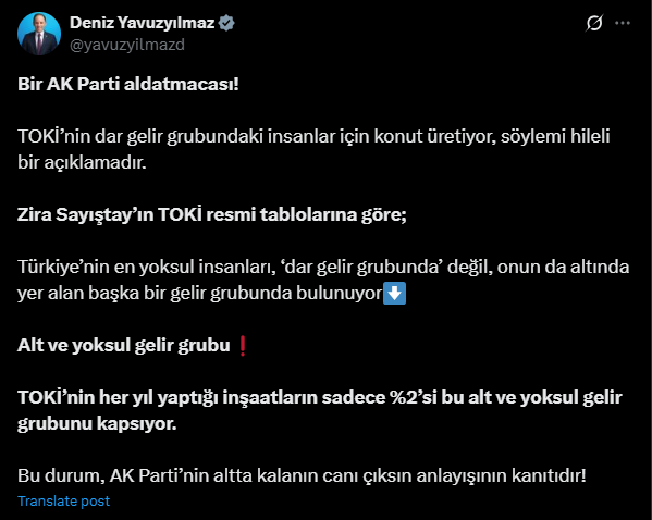 Deniz Yavuzyılmaz, “Toplumumuz ‘TOKİ vasıtasıyla dar gelirli vatandaşlara konut üretiyoruz” dendiği zaman düşünüyor ki, toplum kesimlerinin içinde en alt seviyede dar gelirli vatandaşlarımız var diye düşünüyor. Düşündürülmek istenen de bu zaten ama gerçek bu değil. Gerçek, dar gelirli vatandaşlarımızın altında da, bakın Sayıştay’ın raporuna göre bir kesim daha var. Büyük bir kesim var, ekonomik krizin altında ezilen kesim var. O da, alt ve yoksul gelir grubu diye tarif edilen kesim.” ifadelerini kullanarak “Şimdi bu kesim ifade edilmeden yapılan bir açıklama manipülatif ve kurnazca bir açıklama değil midir? Yüzde 2 saklanıyor işte. Yapılan konut üretiminin yüzde 2’si” açıklamasında bulundu.