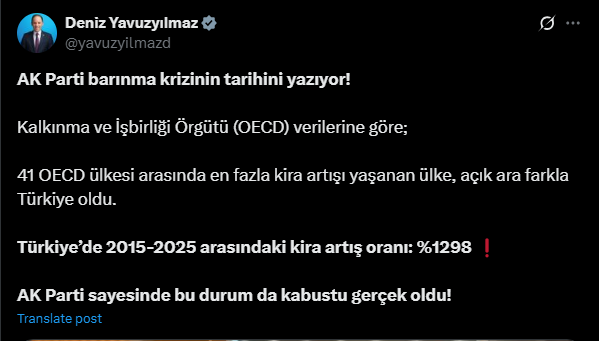 “OECD’nin yayınladığı son raporlara göre, 2015-2025 arasında, 41 ülke arasında en fazla kiraları yükselen ülke Türkiye. 2015 ve 2025 yılları arasında kira artış oranı yüzde 1298.” söyleminde bulunan Yavuzyılmaz, Türkiye’nin grafikteki yeri o kadar yüksek ki, kalan 40 tane ülkeyi toplasanız Türkiye’deki kira artış oranını yakalayamıyorsunuz.” ifadelerini kullanan Yavuzyılmaz, konuya ilişkin sosyal medya hesabından yaptığı açıklamada, “AK Parti barınma krizinin tarihini yazıyor! Kalkınma ve İşbirliği Örgütü (OECD) verilerine göre; 41 OECD ülkesi arasında en fazla kira artışı yaşanan ülke, açık ara farkla Türkiye oldu. Türkiye’de 2015-2025 arasındaki kira artış oranı: %1298. AK Parti sayesinde bu durum da kabustu gerçek oldu!” sözlerini iletti.