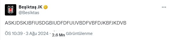 Süper Kupa maçında ezeli rakibi Galatasaray'ı 5-0 gibi farklı bir skorla mağlup eden Beşiktaş, genç golcüsü Mustafa Erhan Hekimoğlu'nun attığı 5. gol sonrası dikkat sosyal medya hesabından dikkat çeken bir paylaşım yaptı. Siyah-beyazlılar, paylaşımda random gülerek "SKJDSKJBFIUSDGBIUDFDFUIJVBDFVBFDJKBFJKDVB" ifadelerini kullandı. Bu paylaşım kullanıcılar tarafından beğeni ve yorumu yağmuruna tutuldu.