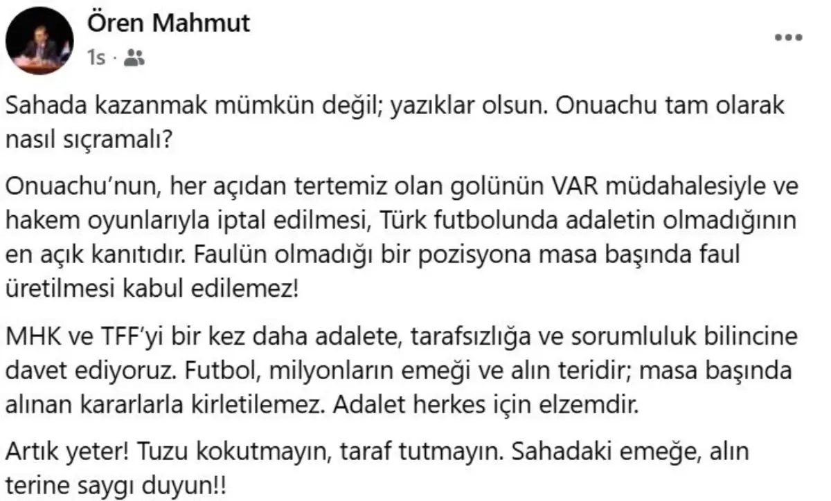 “Sahada kazanmak mümkün değil; yazıklar olsun. Onuachu tam olarak nasıl sıçramalı? Onuachu’nun, her açıdan tertemiz olan golünün VAR müdahalesiyle ve hakem oyunlarıyla iptal edilmesi, Türk futbolunda adaletin olmadığının en açık kanıtıdır. Faulün olmadığı bir pozisyona masa başında faul üretilmesi kabul edilemez! MHK ve TFF’yi bir kez daha adalete, tarafsızlığa ve sorumluluk bilincine davet ediyoruz. Futbol, milyonların emeği ve alın teridir; masa başında alınan kararlarla kirletilemez. Adalet herkes için elzemdir. Artık yeter! Tuzu kokutmayın, taraf tutmayın. Sahadaki emeğe, alın terine saygı duyun.”
