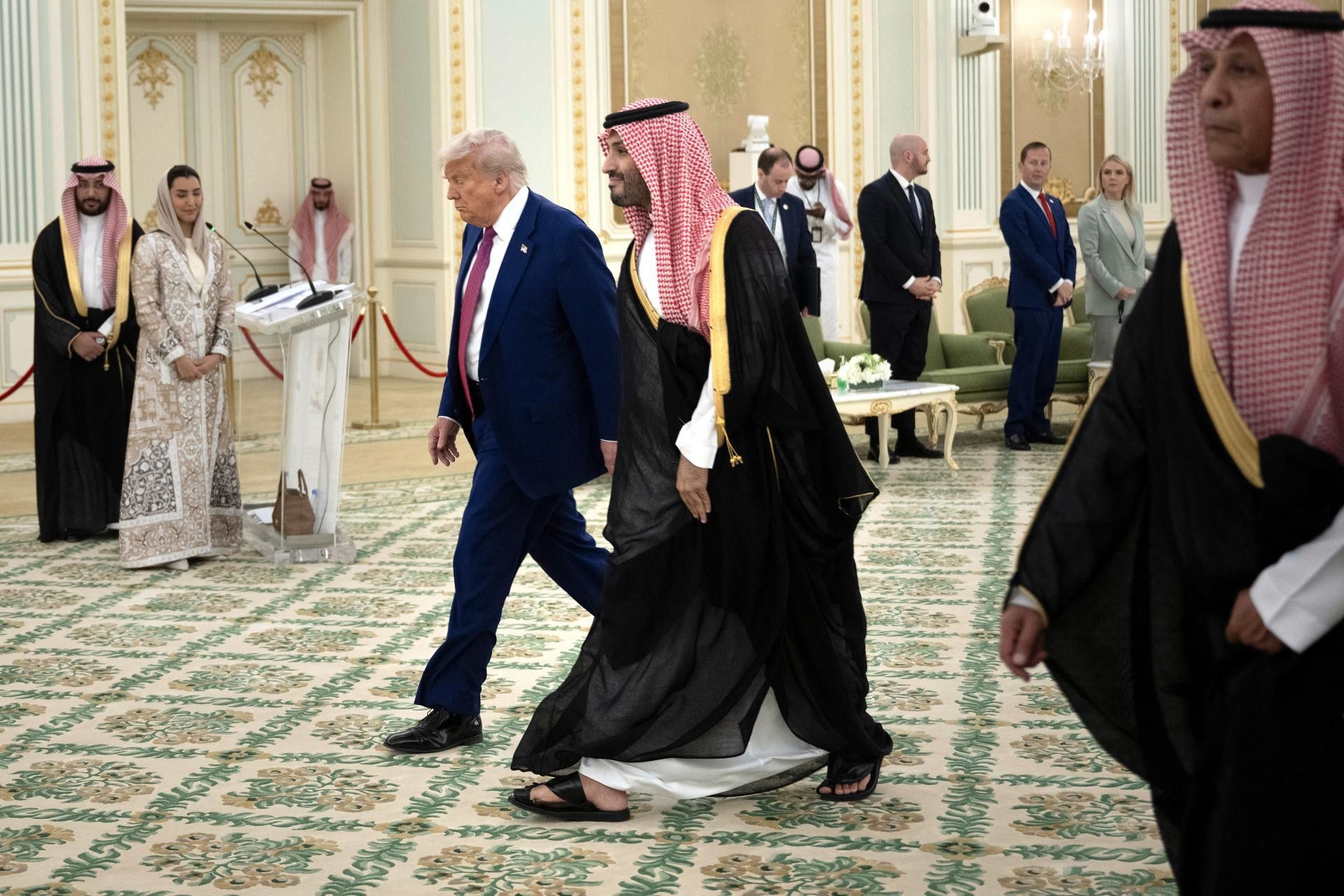 ABD Başkanı’na Suudi Arabistan ziyaretinde kabinesindeki önemli isimlerin yanı sıra danışmanı Elon Musk da dahil olmak üzere Amerikalı iş dünyasının önde gelen isimleri eşlik ediyor. Musk , Veliaht Prens bin Selman’la nadir görülen bir takım elbiseyle görüşürken görülüyor.