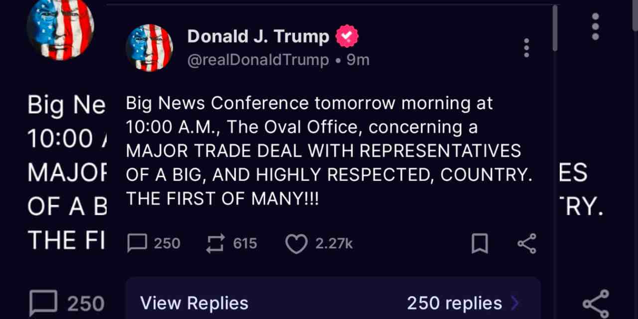 ABD Başkanı Donald Trump, sosyal medya platformu Truth Social hesabından bir paylaşım yaptı. Yarın sabah saat 10.00’da Oval Ofis’te bir toplantı yapılacağı bilgisini paylaşan Trump, bu toplantının amacının ise saygın ve büyük bir ülkenin temsilcileriyle önemli bir ticaret anlaşması olacağını ifade etti. Trump’un paylaşımında, “Yarın sabah saat 10:00’da Oval Ofis’te BÜYÜK BİR BASIN TOPLANTISI yapılacak. SAYGIN VE BÜYÜK BİR ÜLKENİN TEMSİLCİLERİYLE ÖNEMLİ BİR TİCARET ANLAŞMASI hakkında. BİRÇOKLARININ İLKİ!!!” ifadeleri yer aldı.