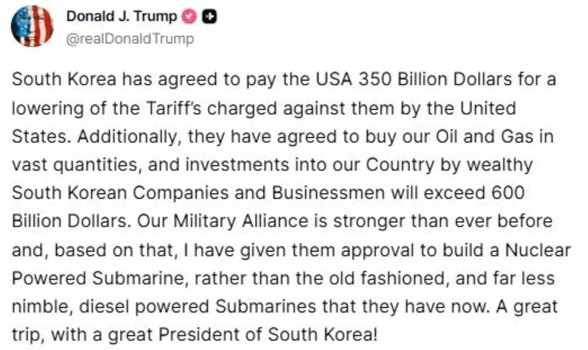 ABD Başkanı Donald Trump, Güney Kore hükümetinin ve özel şirketlerinin ABD’ye toplamda 950 milyar dolarlık yatırım yapmayı kabul ettiğini açıkladı. Trump, ayrıca Güney Kore’ye talep ettiği nükleer denizaltıyı ABD’de inşa etme izni verdiğini söyledi.