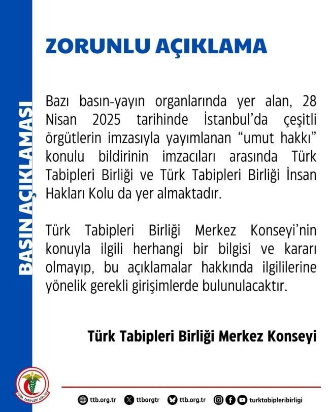 “Bazı basın-yayın organlarında yer alan, 28 Nisan 2025 tarihinde İstanbul’da çeşitli örgütlerin imzasıyla yayımlanan ‘umut hakkı’ konulu bildirinin imzacıları arasında Türk Tabipleri Birliği ve Türk Tabipleri Birliği İnsan Hakları Kolu da yer almaktadır.