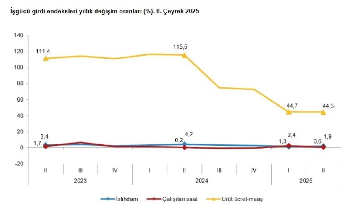TÜRKİYE İstatistik Kurumu (TÜİK), 2025 yılı 2’nci çeyreğinde istihdam endeksinin yıllık yüzde 1,9, çalışılan saat endeksinin yüzde 0,6, bürüt ücret-maaş endeksinin ise yüzde 43,3 arttığını açıkladı.