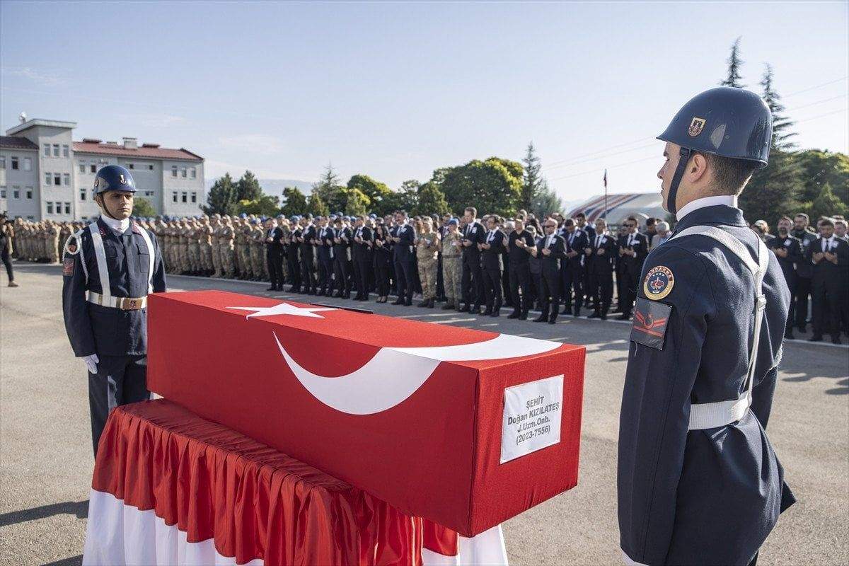 Tunceli İl Jandarma Komutanlığında gerçekleştirilen törende şehitler Uzman Çavuş Mehmet Aykanat, Uzman Çavuş Orhan Burak Büyükçaylı, Uzman Onbaşı Doğan Kızılateş’in Türk bayrağına sarılı naaşı alana getirilerek katafalka konuldu.