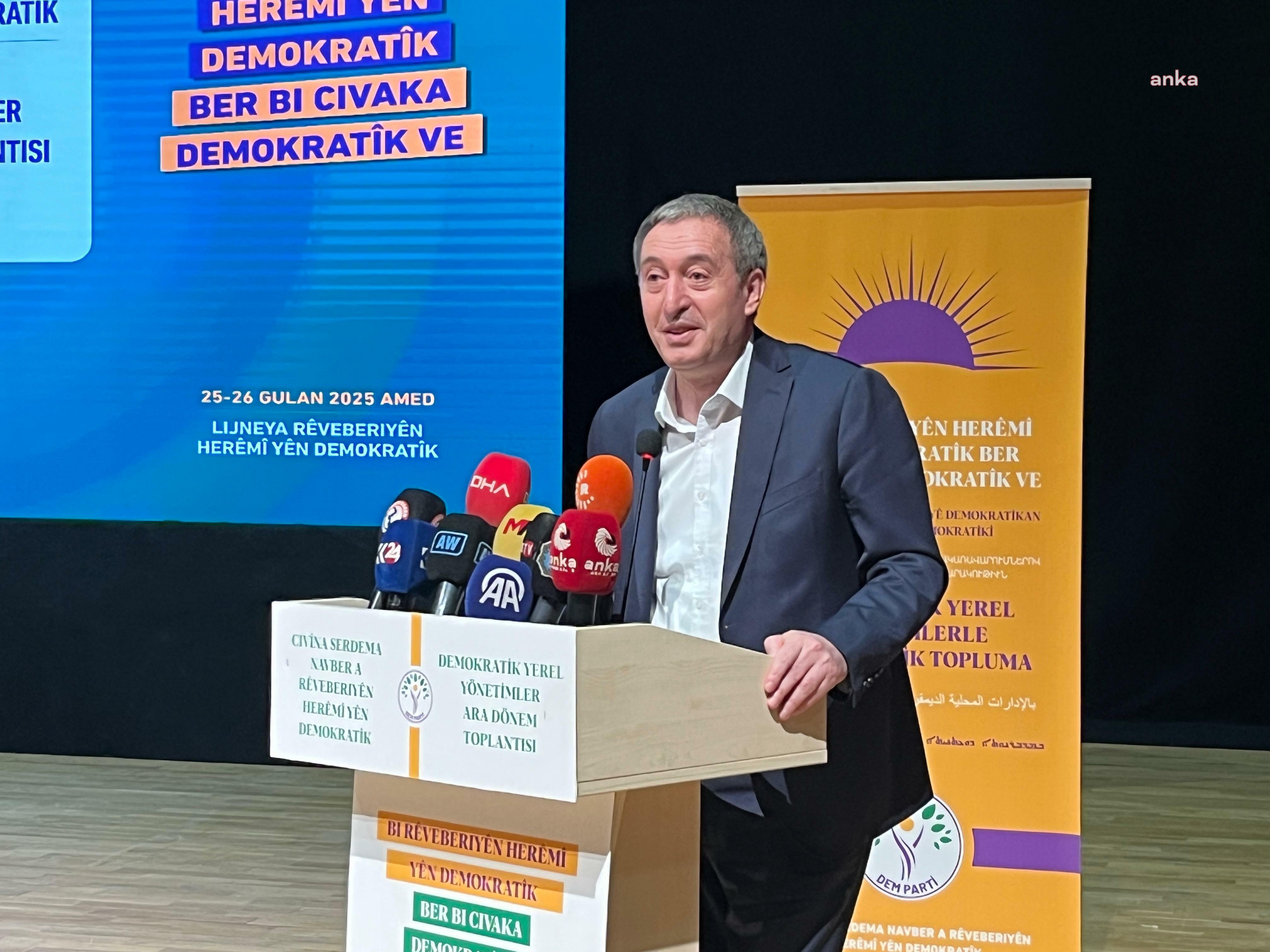 “Allah aşkına akşam çocuklarınız, aileleriniz de arkadaşlarınız da televizyon kanallarını, yorumları izlediğinizde bu ülkede gerçekten 100 yıllık bir mesele çözülüyor çıkarabilir misiniz? Bu ülkede barış tartışılıyor. Son 50 yıllık çatışma ve şiddet ortamı ortadan kaldırılıyor diyebilecek tek bir kişi var mı? Kul var mı? Dile dikkat edilmesi gerekiyor. Demokratik toplum ancak demokratik bir dil üzerinden inşa edilebilir. Barış süreci dille şekillendirilir. İktidarın medyasında kullanılan dil ve söylemler çok rahatsız edicidir. Eminim siz de rahatsız oluyorsunuz. Hatta size oy veren, o onurlu, o vazgeçmeyen, o üç dönem kayyuma rağmen yanımızda duran, önümüzde mücadele eden halkımız da rahatsızdır. Bu dil toplumsal barışı dinamitliyor. Dolayısıyla en başta iktidarı ve ona yakın medya kuruluşlarını dil konusunda bir samimiyete bir ciddiyete davet ettiğimi Diyarbakır’dan belirtmek istiyorum. Siz de izliyorsunuz. Karaktersiz, karakteri küçük kimi insanlar yüzeysel, irrite edici, rahatsız edici dil kullanıyor. Biz bu dili reddediyoruz. Bu küçük karakterli insanlarla Türkiye’nin 100 yıllık toplumsal barışı konuşulur, tartışılır mı? Neymiş? Siyasi tutsak demeyecekmişiz. Ne diyeceğiz? Eşya adıyla çağırılır. Danışmana danışman diyoruz. Selahattin Demirtaş’a Figen Yüksekdağ’a da siyasi tutsak diyoruz. Sanki hukuk var. Sanki insanlar düşüncelerinden inançlarından dolayı içeride değil sanki demokrasi var. Siyasi tutsak demeyecekmişiz. Bir taraftan da haklı aslında. Siyasi rehine mi diyelim o zaman? Bu dilden bir an önce vazgeçilmelidir.”