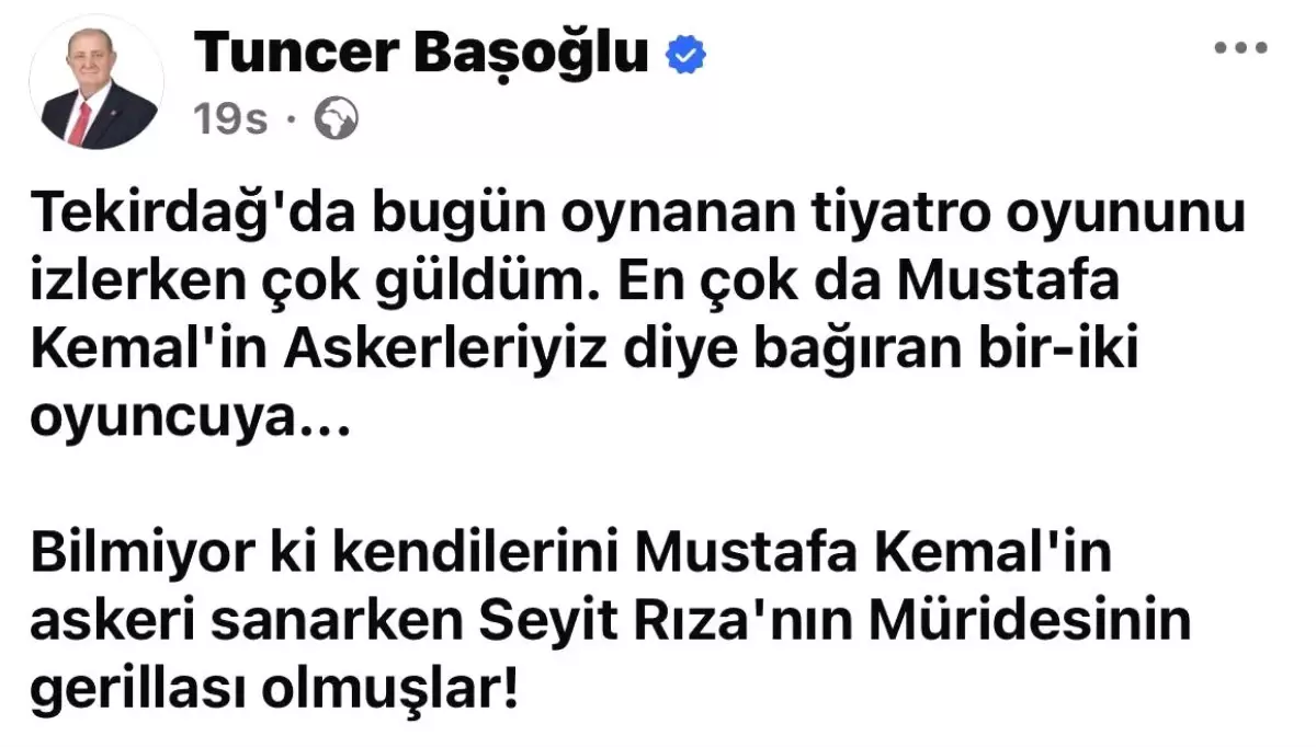 Geçtiğimiz günlerde CHP’den istifa eden Hayrabolu Belediye Başkanı Tuncer Başoğlu, sosyal medya hesabından yaptığı paylaşımda, izlediği bir tiyatro oyununa atıfta bulunarak, “Tekirdağ’da bugün oynanan tiyatro oyununu izlerken çok güldüm. En çok da ‘Mustafa Kemal’in askerleriyiz’ diye bağıran bir-iki oyuncuya. Bilmiyor ki, kendilerini Mustafa Kemal’in askeri sanarken Seyit Rıza’nın müridesinin gerillası olmuşlar” ifadelerini kullandı.