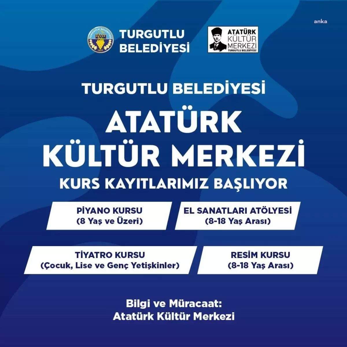 (MANİSA) – Turgutlu Belediyesi Atatürk Kültür Merkezi (AKM) bünyesinde çocuk ve yetişkinlere yönelik açılan resim, tiyatro, piyano ve el sanatları kurslarına kayıtlar başlıyor.