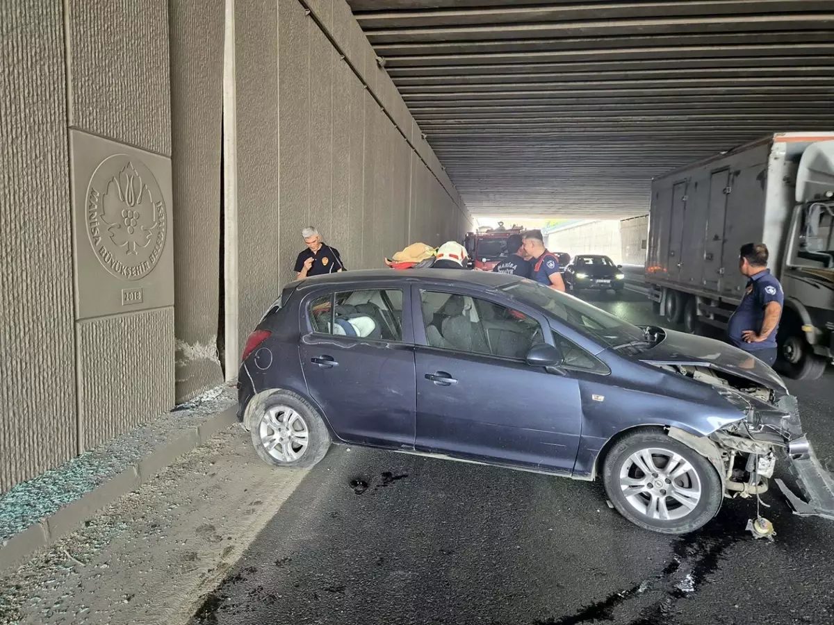 Manisa'nın Turgutlu ilçesinde lastiği patlayan otomobil, tünel duvarına çarparak kaza yaptı.