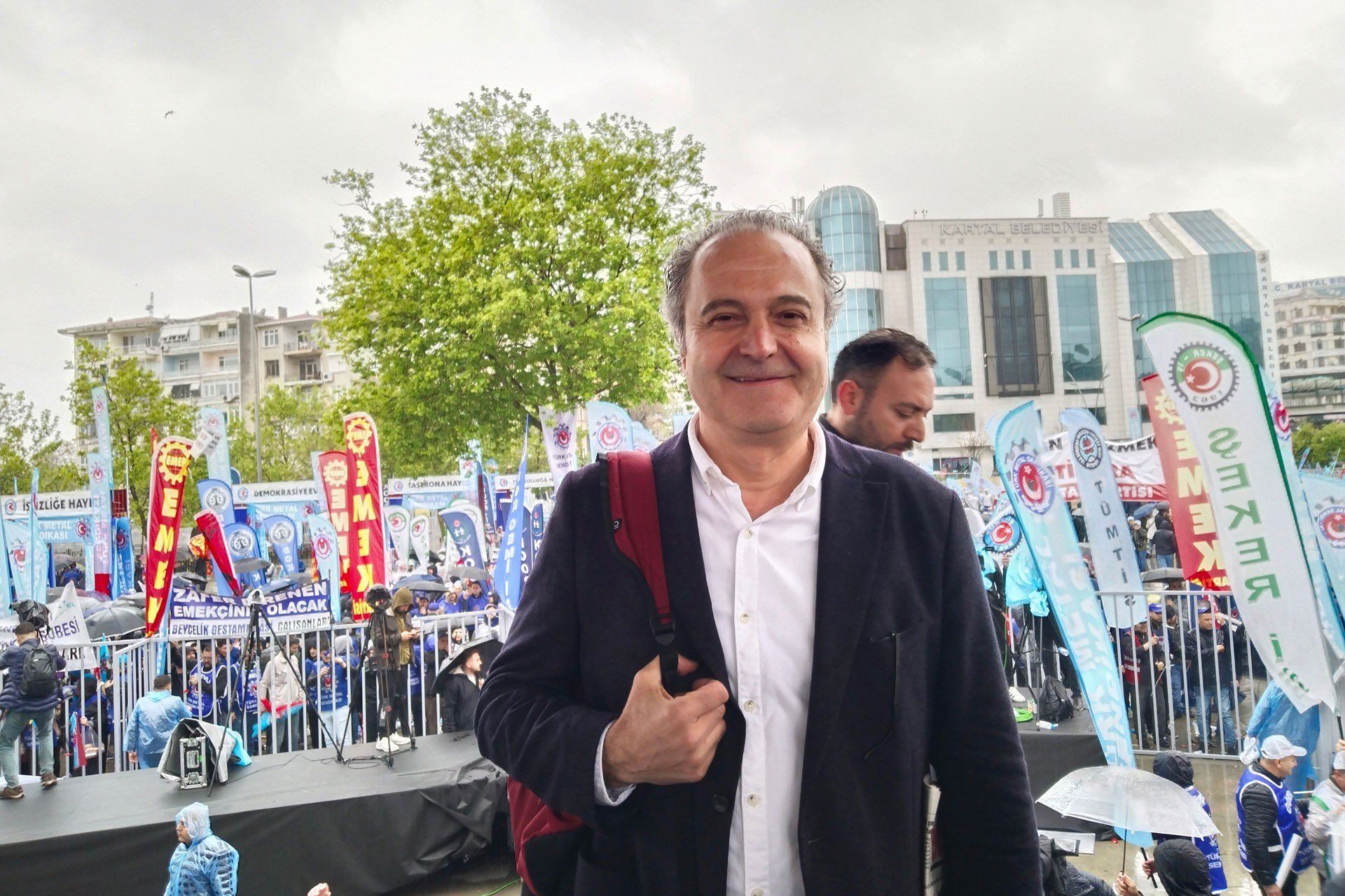 Türkiye İşçi Sendikaları Konfederasyonu’na (Türk-İş) bağlı sendikalar, 1 Mayıs’ta Kartal Meydanı’nda bir araya geldi. Meydanı dolduran işçiler ,”Kurtuluş yok tek başına, ya hep beraber ya hiç birimiz”, “Birleşe birleşe kazacağız”, “Vergide adalet istiyoruz” sloganlarıyla yağmur altında 1 Mayıs’ı kutladı.