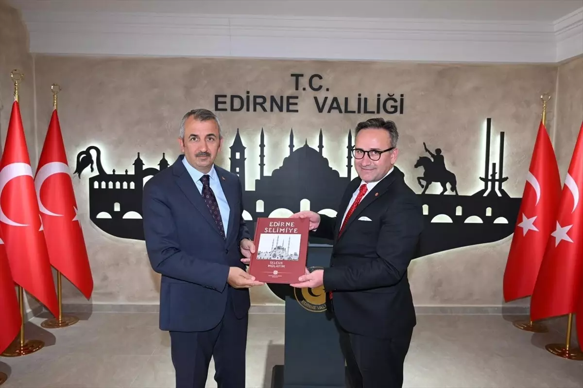 Prof. Dr. Yüksel Özgen, Edirne Valisi Yunus Sezer'i ziyaret etti ve kitap hediye etti.