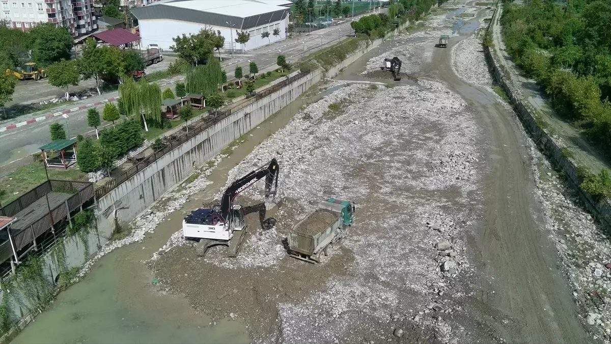İlçede 2021 yılı ve geçen yıl meydana gelen taşkınlar sonrasında dere yataklarında biriken taş, çakıl, ağaç dalları gibi maddeler, DSİ’ye ait iş makineleriyle temizlenip kamyonlara yüklenerek belirlenen alanlara götürülüyor.