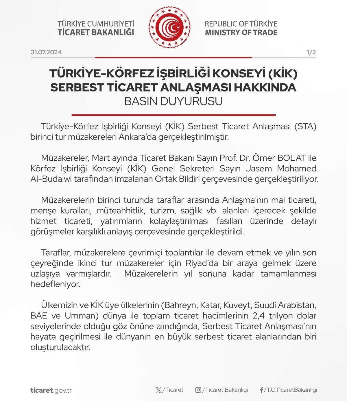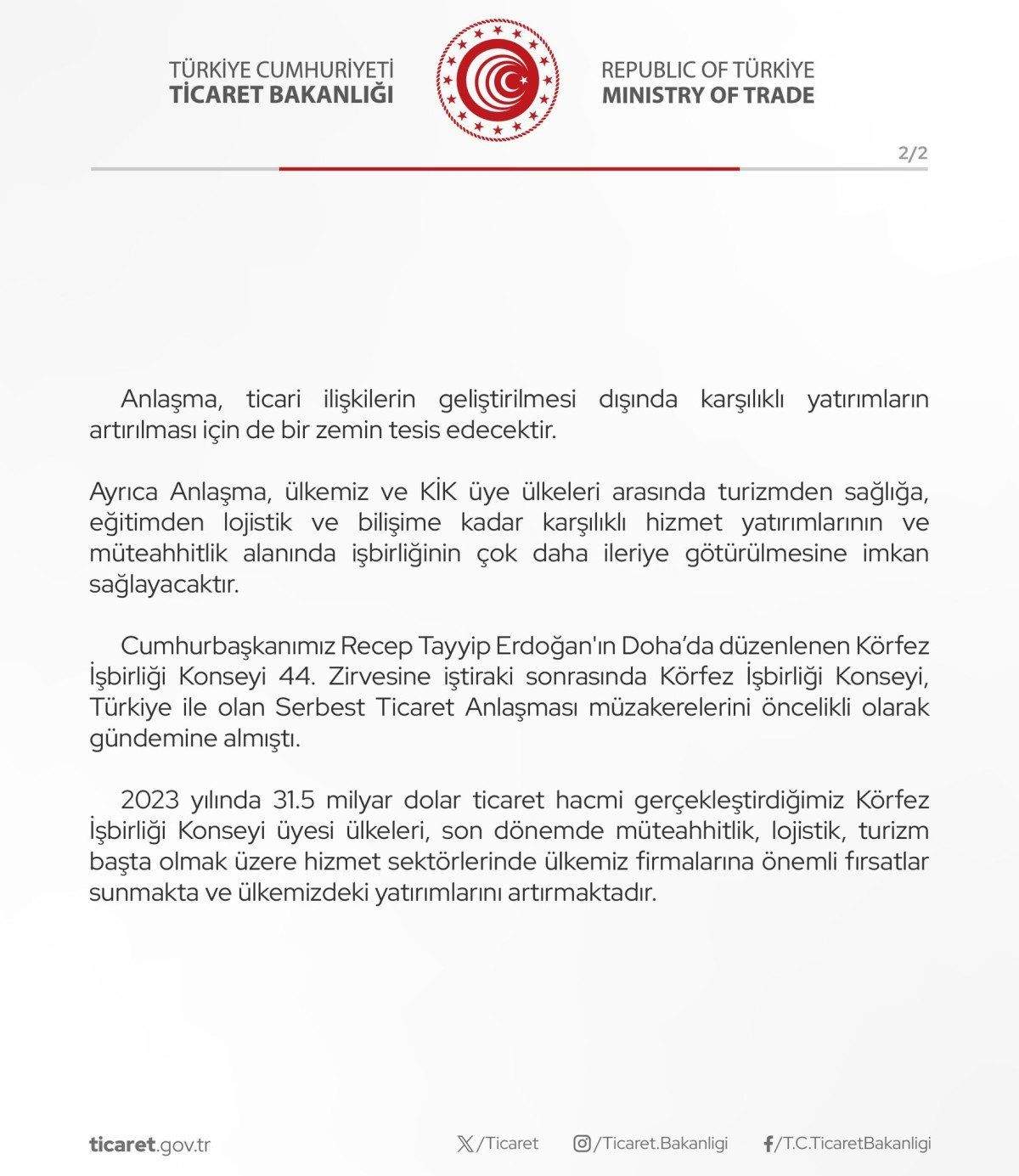 Duyuruda Cumhurbaşkanı Recep Tayyip Erdoğan’ın Doha’da düzenlenen Körfez İşbirliği Konseyi 44. Zirvesine iştiraki sonrasında Körfez İşbirliği Konseyi, Türkiye ile olan Serbest Ticaret Anlaşması müzakerelerini öncelikli olarak gündemine aldığı hatırlatıldı.
