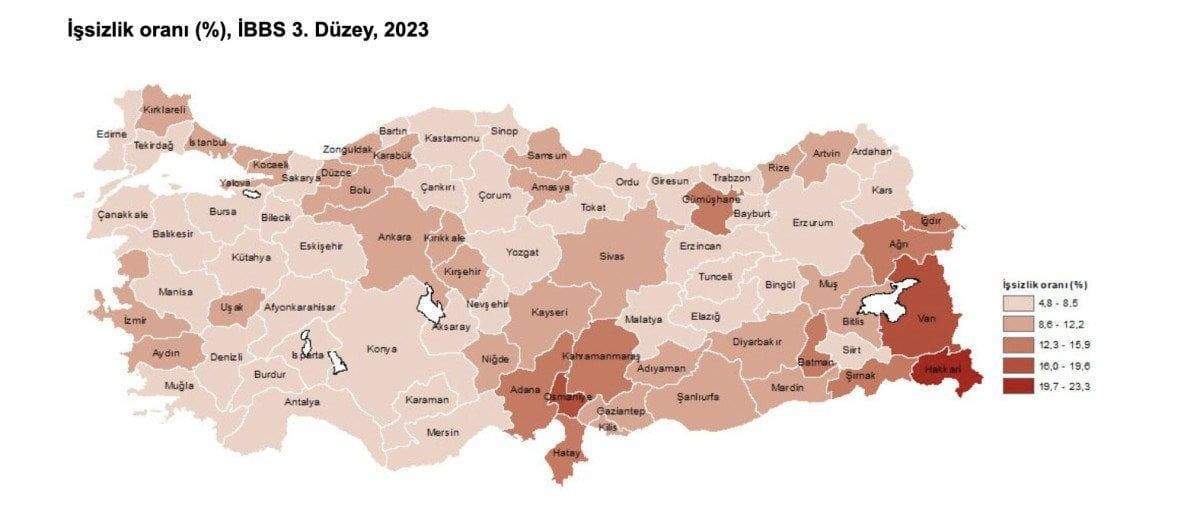 İşsizlik oranı en yüksek il yüzde 23,3 ile Hakkari iken, işsizlik oranı en düşük il yüzde 4,8 ile Sinop oldu.