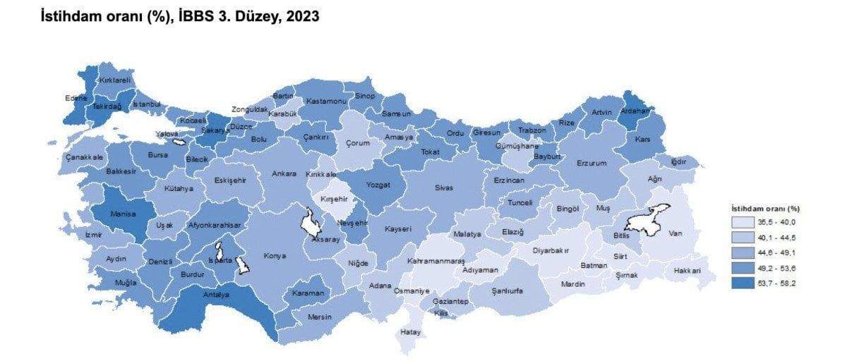 En yüksek istihdam oranı yüzde 58,2 ile Ardahan ilinde gerçekleşti. En düşük istihdam oranı ise yüzde 35,5 ile Siirt ilinde gerçekleşti.